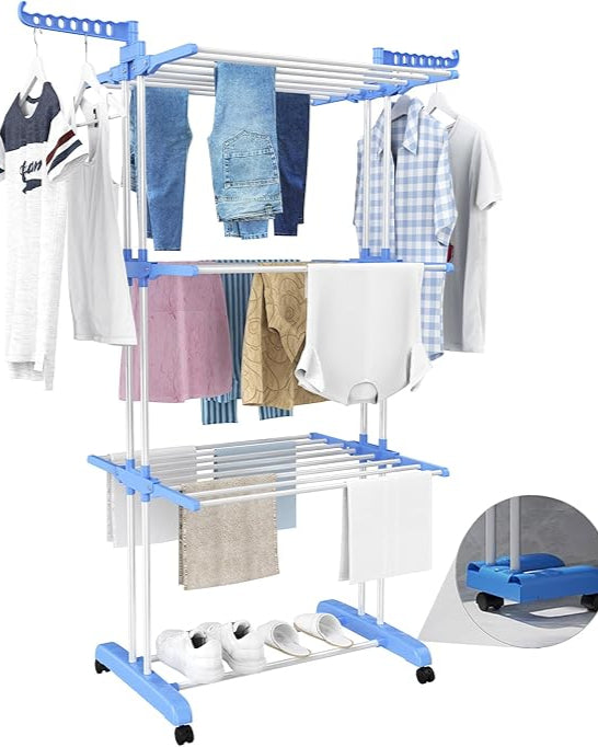 رف تجفيف ملابس عائلي فخم 4 مستويات بعجلات قابلة للقفل