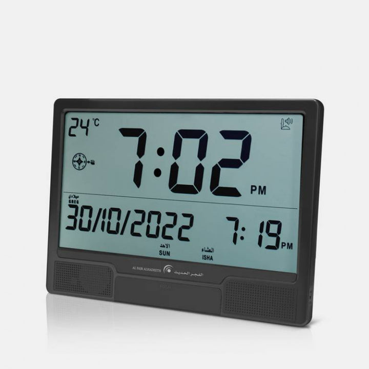 ساعة الفجر الحديث حائط موديل AL203 مميزات المنتج: أوقات الأذان لجميع مدن العالم. الأذان كاملاً للصلوات الخمس مع توقيت الشروق. منبه لكل صلاة. تاريخ هجري وميلادي. خمس تقاويم مختلفة لحساب الأذان. منبه يومي للمواعيد الثابتة. تعمل بالبطاريات فقط