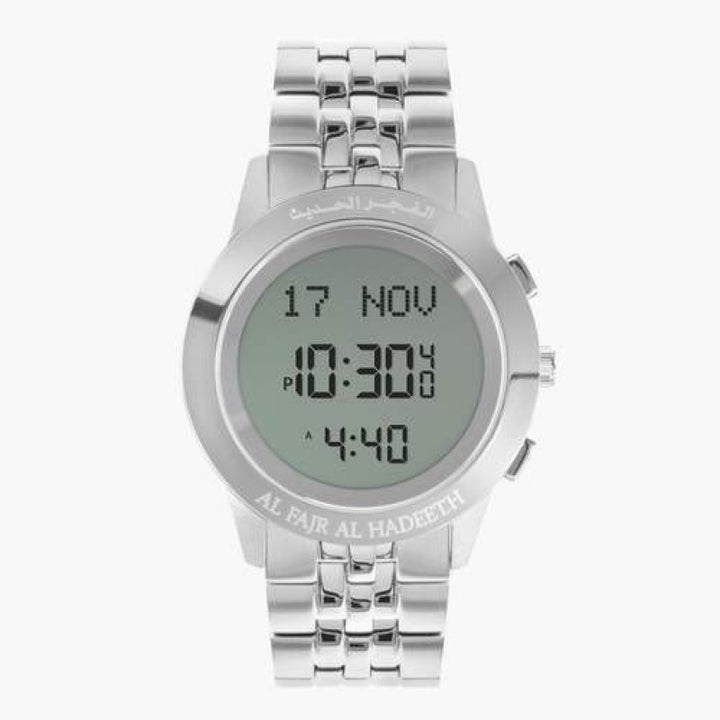 ساعة الفجر الحديث كلاسيكية مدورة الشكل مصنوعة من الستانلس ستيل باللون الفضي وشاشة بيضاء