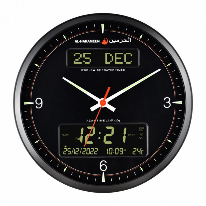 - ساعة الحائط الدائرية بعقارب و شاشة لعرض وقت الصلاة والتاريخ